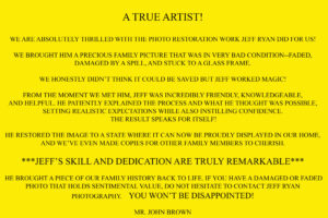 *5 STARS!***** 🙂 JEFF DID A GREAT JOB OF RESTORING AN OLD PHOTO OF MINE FROM THE 1980’s. HE WAS SO PLEASANT TO WORK WITH! THE PHOTO HAD EXTENSIVE WATER DAMAGE AND THE NEW VERSION LOOKS AMAZING! I WOULD NOT HESITATE TO USE JEFF AGAIN FOR ANY PHOTOGRAPHY RELATED SERVICES. SUSAN S.